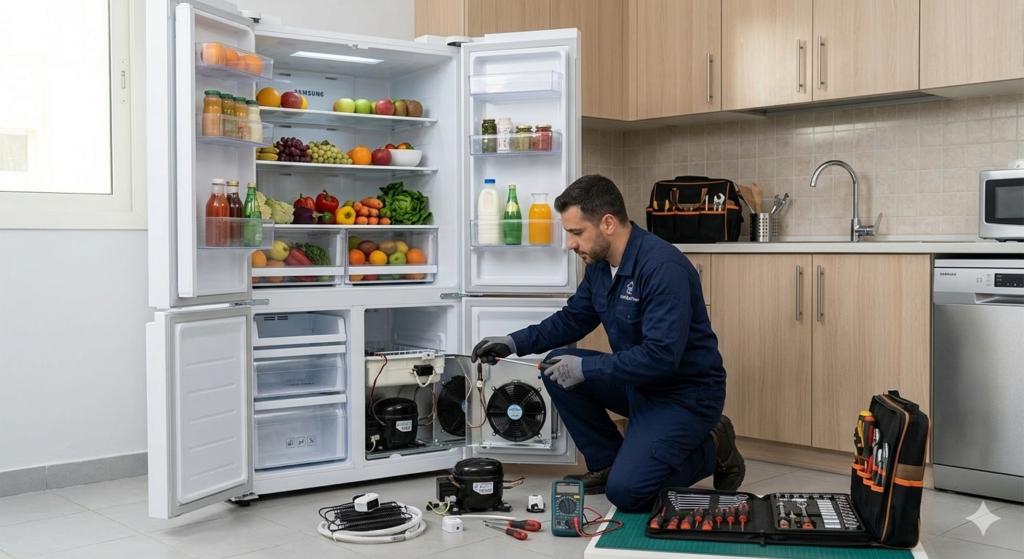 • التنظيف الدوري: في الموديلات “الديفروست”، يجب فصل الجهاز كل فترة لإذابة الثلج تماماً وتنظيف حوض الصرف الخلفي فوق الموتور لمنع الروائح الكريهة.